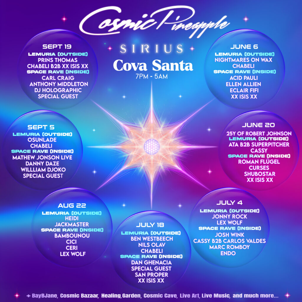 Renowned for their purpose-driven parties, Cosmic Pineapple’s new residency at Cova Santa offers an immersive experience that combines hedonism with healing. This unique mini-festival creates a transformative atmosphere, where attendees can indulge in the vibrant nightlife while also engaging in wellness activities designed to rejuvenate the mind and body.